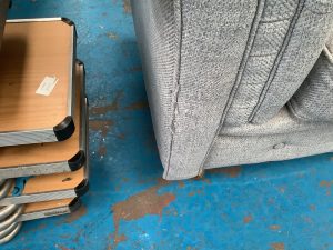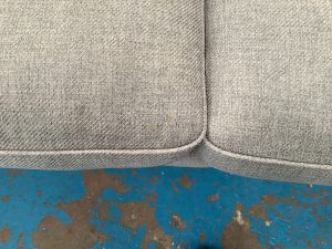 This is a light grey fabric Chesterfield sofa featuring classic deep button upholstery, rolled arms, and a buttoned front border. Some small clicks and marks as seen in the pictures but otherwise in great condition.