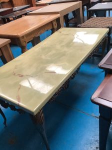 Coffee table features an onyx marble top with green, brown, and cream veining and metal frame and legs.