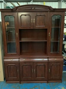 87” tall 67” wide and 17” depth. Large mahogany display cabinet. Dismantles for easier access during delivery.