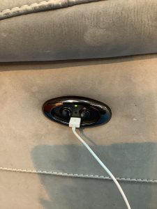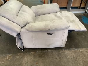 The Furniture Village Recliner Armchair in grey is designed for both comfort and convenience. It features a fully functional recline mechanism and includes a USB port for device charging, enhancing its usability. Despite signs of prior use, the chair remains in good condition, making it a practical addition to any space.
