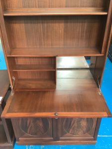 - Display Features: Open mirrored section for bottles or glassware, and a top open section with a fixed shelf for books or ornaments. With functioning lock and key.